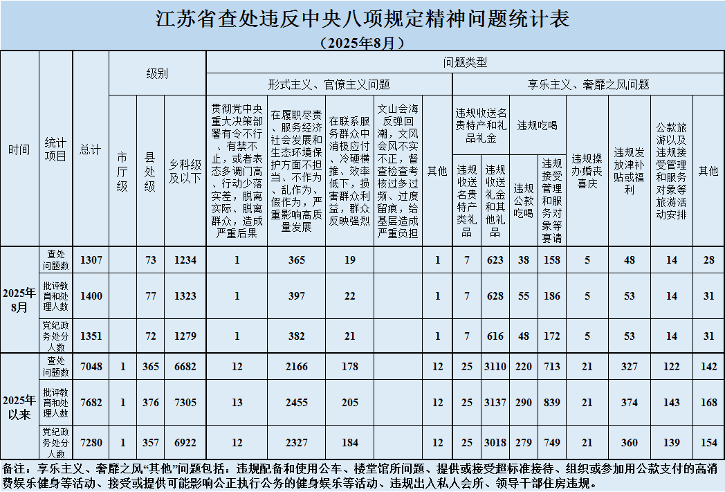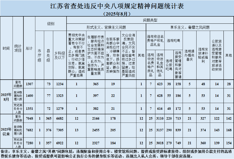 2025年8月,全省共查处违反中央八项规定精神问题1307起,批评教育和处理1400人、其中给予党纪政务处分1351人。从问题类型看,查处形式主义、官僚主义问题386起、批评教育和处理421人,查处享乐主义、奢靡之风问题921起、批评教育和处理979人。从人员级别看,批评教育和处理县处级干部77人、乡科级及以下人员1323人。(信息来源:江苏省纪委监委)