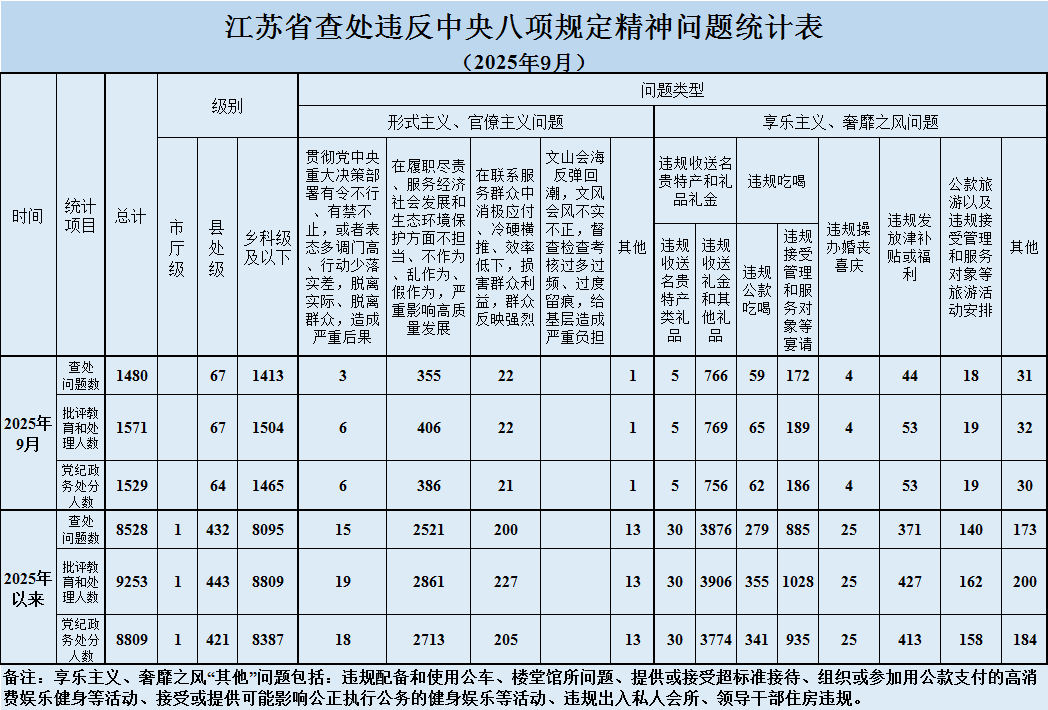 2025年9月,全省共查处违反中央八项规定精神问题1480起,批评教育和处理1571人、其中给予党纪政务处分1529人。从问题类型看,查处形式主义、官僚主义问题381起、批评教育和处理435人,查处享乐主义、奢靡之风问题1099起、批评教育和处理1136人。从人员级别看,批评教育和处理县处级干部67人、乡科级及以下人员1504人。(信息来源:江苏省纪委监委)